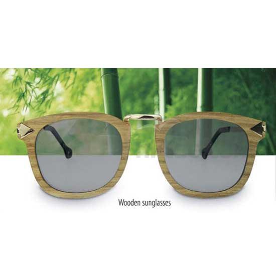Displayed is a pair of sunglasses made of bamboo and wood for a unique touch. The shiny bridge and arrow-like details at the corners show attention to details. This pair of tasteful sunglasses is an ideal accessory for wear on sunny days.
