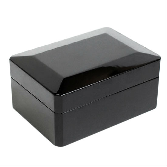 The highlighted box is made of wood and has a rectangular body. It has a glossy black toned exterior and is covered with a lid. This box is ideal for storage and packaging use.