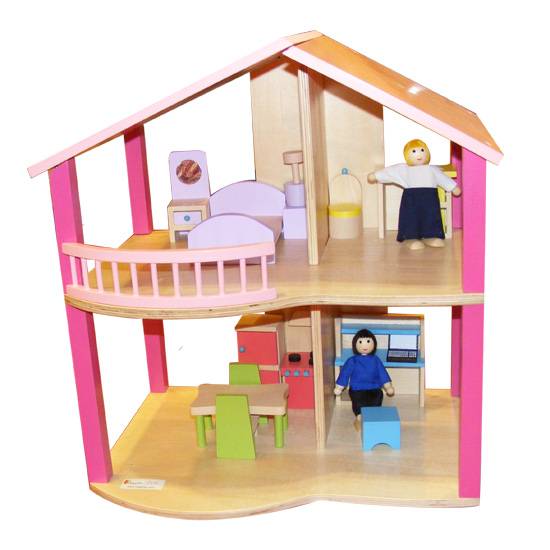 This two-story dolls house features the necessary toy furniture to build a toy house. It includes a bed, a table, chairs, a refrigerator, a stove and other furniture. It also comes with two people which make this dolls house a family.