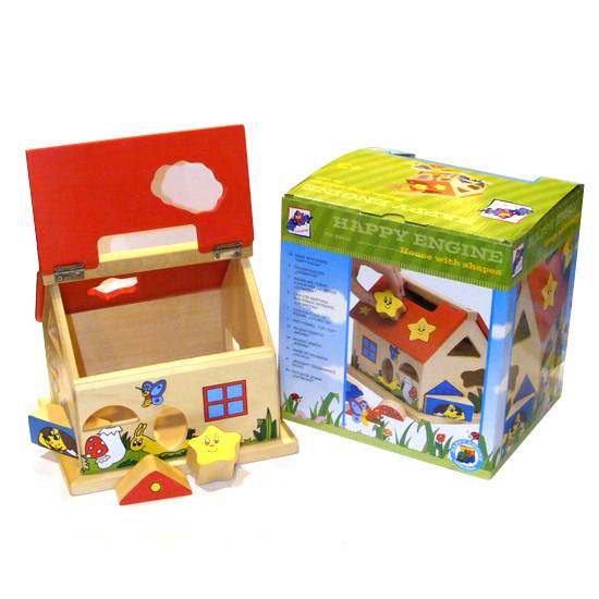 The featured item is a wooden house for children above the age of 2. This toy is ideal in helping young children identify shapes.