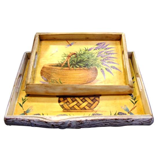 As shown are wooden trays with beautiful pictures on them. The print is highly water resistant, so the pictures can last long. Besides, made of quality wood, these trays are known for their durability.