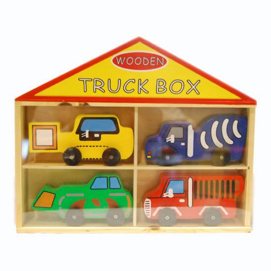 This is a set of wooden trucks packed in a painted wooden shelf. The mini trucks are finely polished and painted in sharp colors for an adorable look. The truck set can be a funny toy to children, as well as a cute decoration at home.