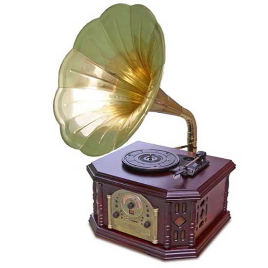 Pictured is a full-size wooden turntable combo with a handmade metal horn. The classic design looks gorgeous and easily matches any modern home decor. This belt-driven turntable plays 33, 45 and 78prm records.
