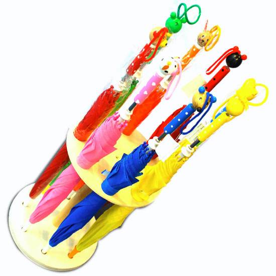 These are wooden umbrellas in vibrant and vivid colors. They come with stylish and adorable animal handle topping for a whimsical touch. Keep the little ones dry in the rain with either of these adorable and cute wooden umbrellas.