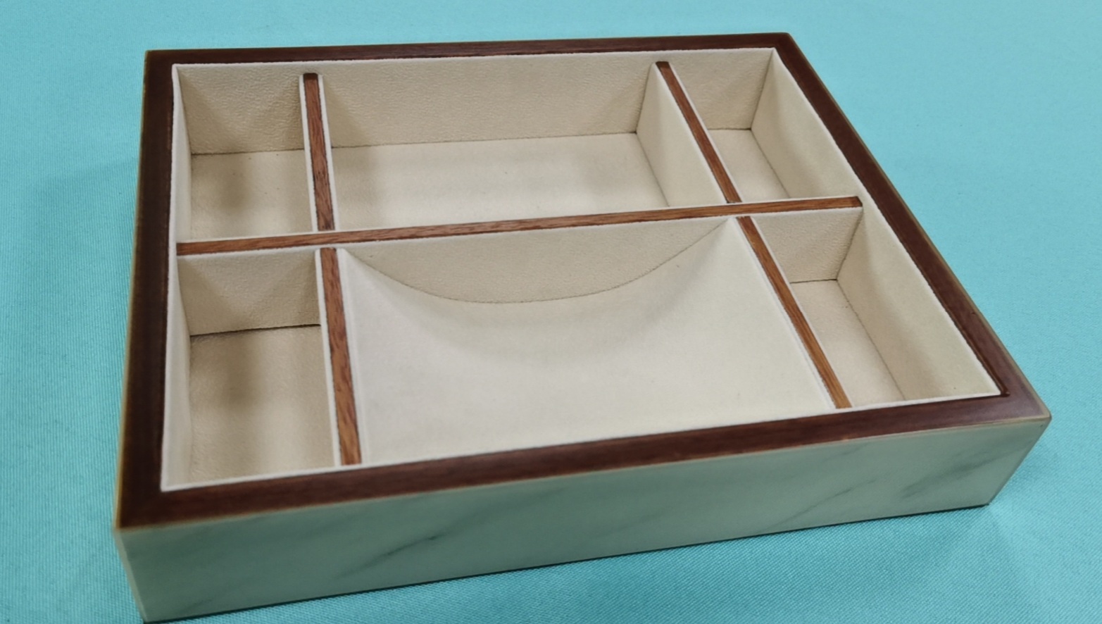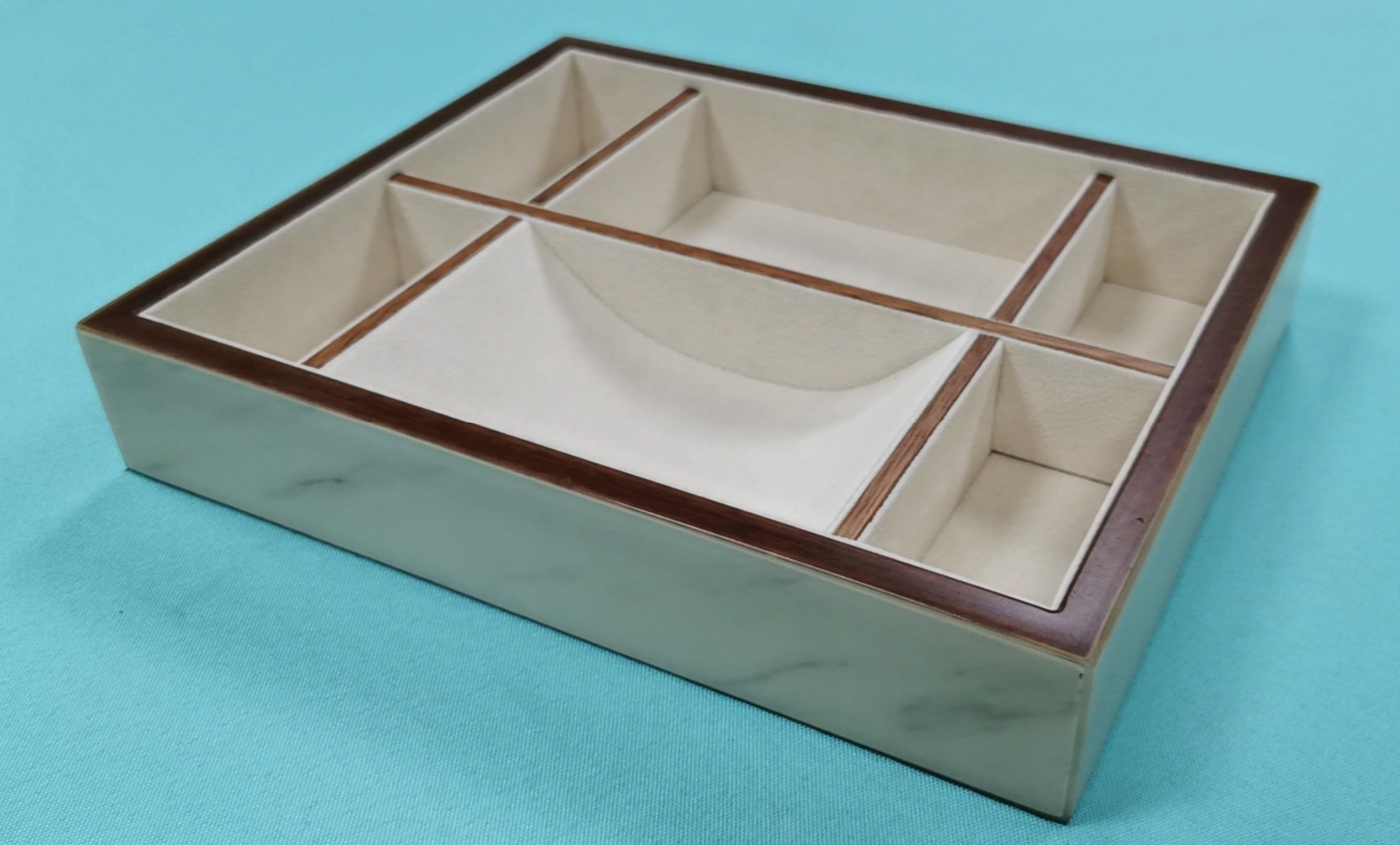 • Wooden valet tray with special marble finish, piano finish. Compartment with velvet lining.