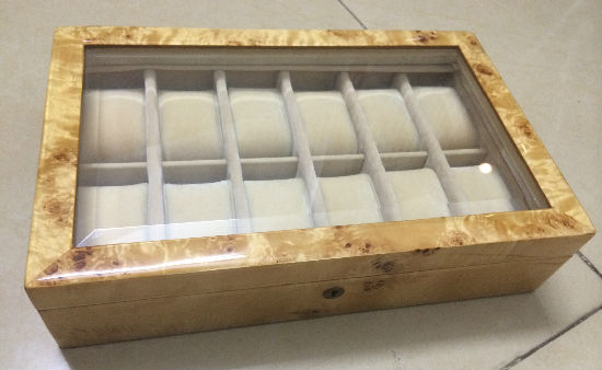 • This neatly designed wooden watch box could hold up to 12 watches.
