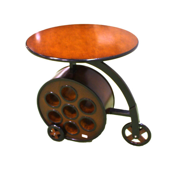 The picture features a wooden wine holder of a unique style. The wine holder boasts the appearance of an antique bicycle with a big and a small wheel. This elegant wine holder can showcase the exceptional taste of the wine owner.