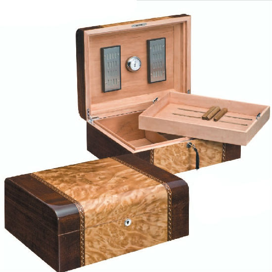 This elegant wooden cigar humidor is decorated with beautiful camphor burl veneer and marquetry inlay, piano finish. With a removable tray to maximize space for storage.