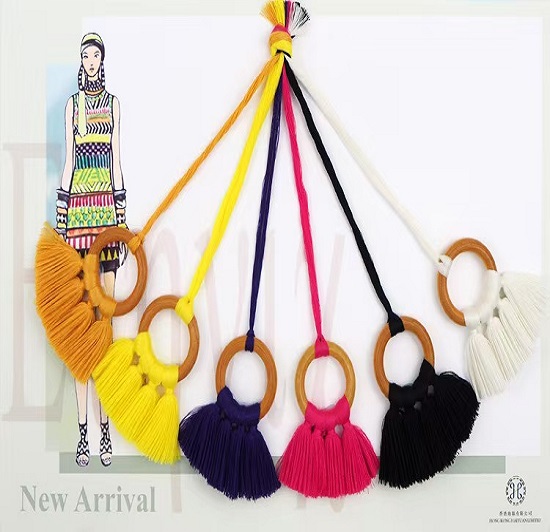 Wooden ring tassels are a decorative element that combines natural wooden hoops with dangling tassels, often used in handicrafts, home décor, and fashion accessories. The design typically features a wooden ring (made of beech, walnut, or bamboo) as the top structure, with suspended tassels crafted from silk, cotton, or leather strips, blending rustic charm with minimalist aesthetics. Wooden ring tassels add a warm, artisanal texture while creating visual contrast between the wood and tassel materials. They are ideal for creative items like wall hangings, keychains, earrings, and curtain ties.