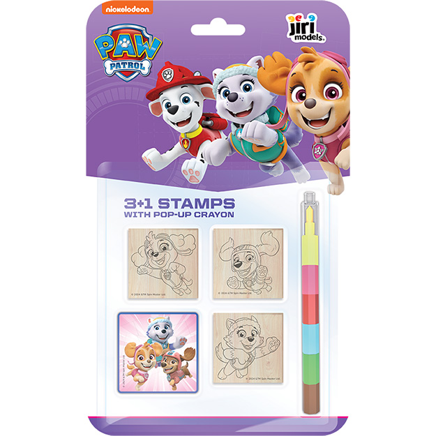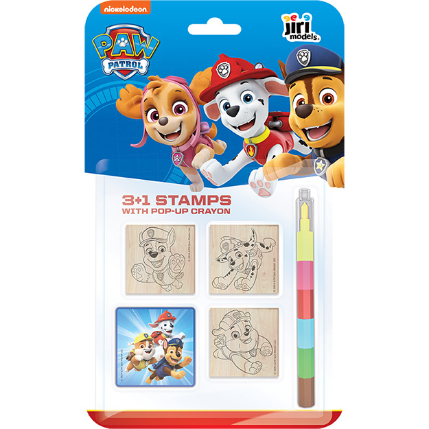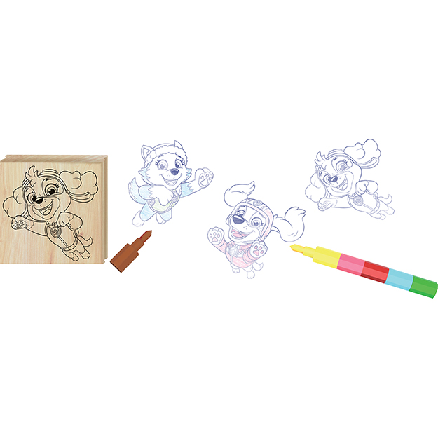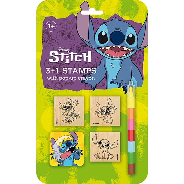 The set contains 3 easy-to-grasp wooden stamps, a coloured inkpad with popular motif, and a 6-colours pop-up crayon.