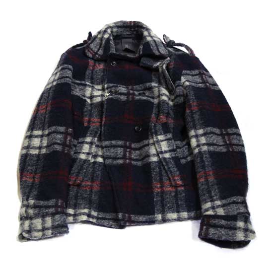 The displayed jacket features dark-toned plaid patterns which are stylish on the wearer. It is fabricated from 55% wool for added warmth. The epaulet and slash pocket design brings extra appeal to the look.