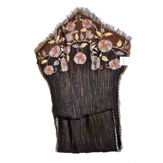 This wool scarf boasts an artistic design. Both ends are gracefully embroidered with floral patterns in harmonious colors. Its hems are trimmed with splendid diamond patterns. This wool scarf accentuates the glamor of the wearer.