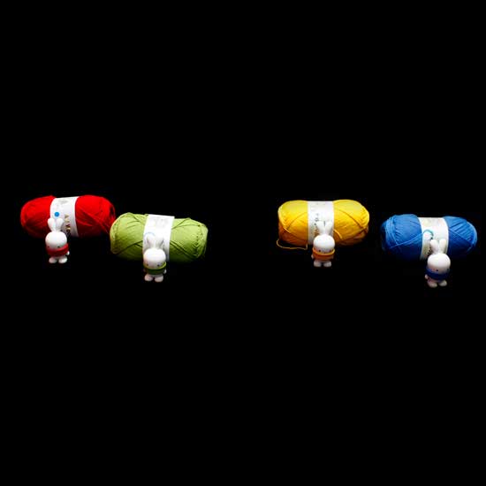 Featured here are four rolls of knitting yarn in red, green, yellow and blue color. The soft and lightweight woolen yarn is excellent for knitting and crocheting. The scarves of lovely Booto rabbits are woven from this luxurious woolen knitting yarn.