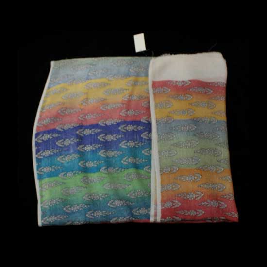 This woolen scarf features a fabulous design of rainbow colors. A ethnic print pattern adds decorative detail to this accessory. This stylized garment is a bold complement to your everyday look.