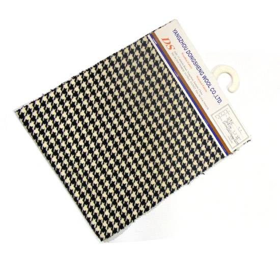 This is a piece of woollen fabric sample. It has a black, grey and blue gingham pattern. It can be used for manufacturing all kinds of garment and clothing.