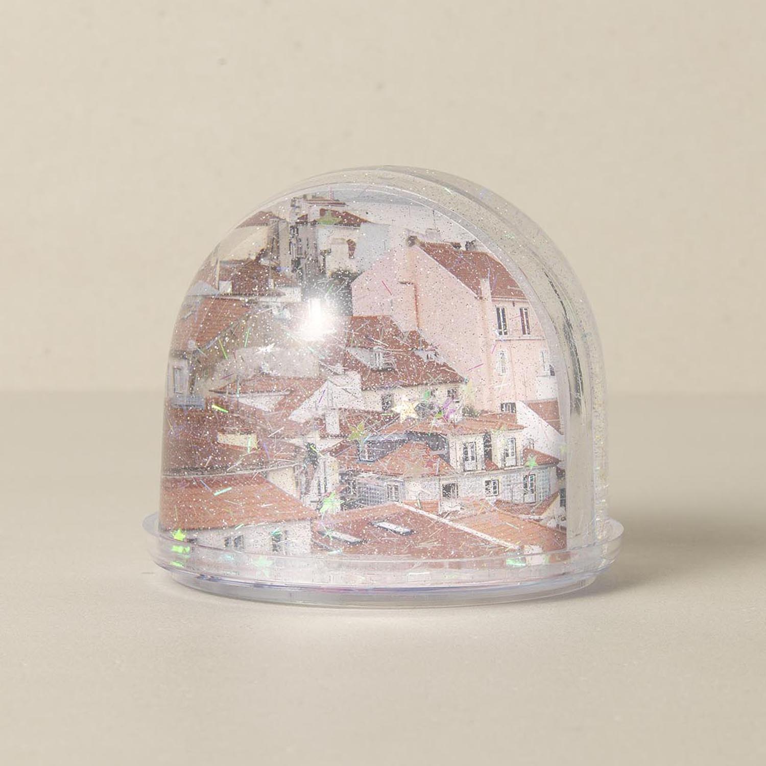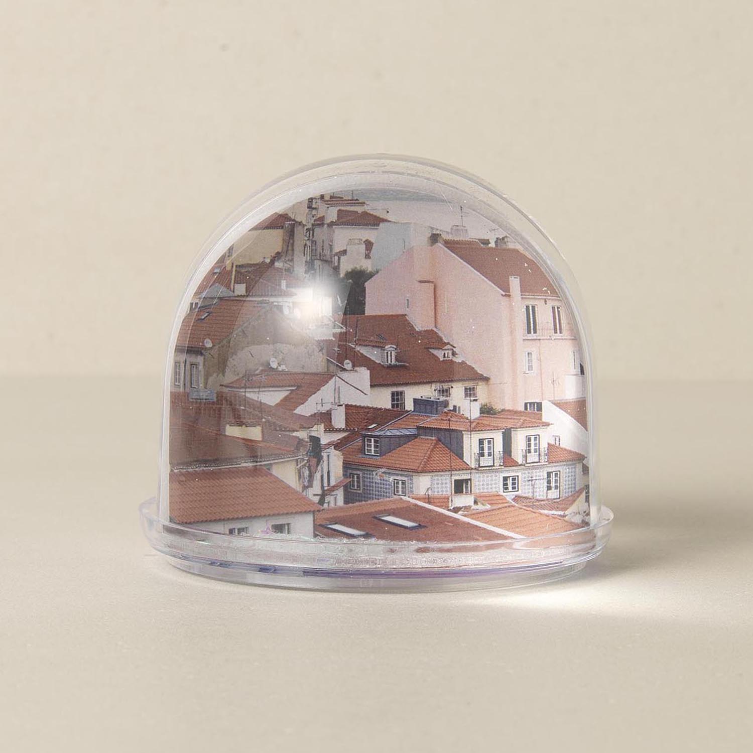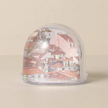 Classic photo water globe that is perfect for displaying your favorite photo. Rounded water globe that fits two photos, filled with water and shimmering glitter inside.