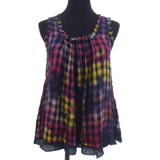 The woven blouse comes with tie-dyed construction on the classic checker pattern. The lace trimming adds a cute accent to the entire piece. This woven blouse matched summer casual wear easily.