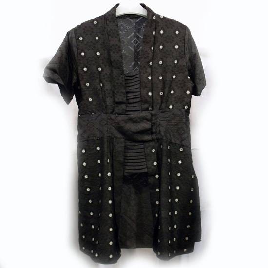 This dress features the design of Japanese kimonos with wrapping and a thick waistband. The fabric comes with subtle patterns all over and floral embroidery trim. It matches perfectly with the lining that is full of horizontal pleats.