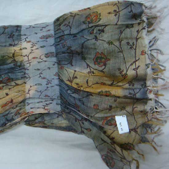 This woven scarf features delicate floral patterns with detailed branches and leaves. An interesting combination of blue and yellow makes this scarf different from others. Short tassels finish this adorable scarf.