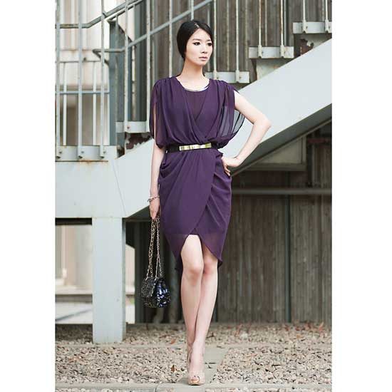 This ladies’ dress is sure to steal the limelight with its rich purple color. The wrap dress flaunts draped fabrics over the bodice and ruched details on the skirt. The shimmering gold-tone belt simply shapes the formfitting feminine silhouette, airing an elegant aura.