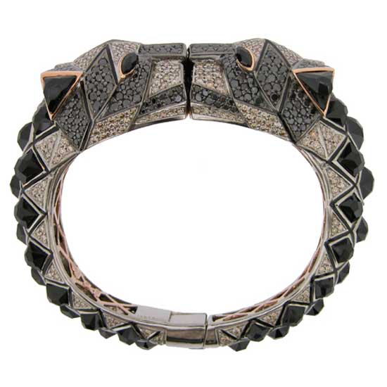 Featured here is a tiger-themed bangle that boasts an exotic design. The sparkling black and brown diamonds blend perfectly for a unique touch. This classy bangle makes a stylish and versatile fashion accessory you want to own.