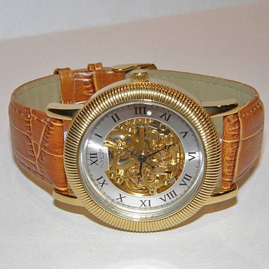The wrist watch features a leather wrist band with a fine, textured surface. The featured watch contains a transparent body which presents the intricate clockwork inside the watch. The watch has a thick rim in a golden tone.