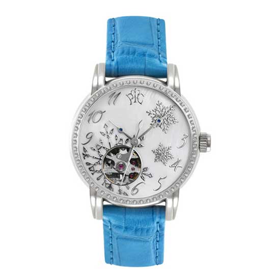 The collection "Russian Winter" gathered in itself the most beautiful elements of this season. The iridescent dial is made of mother-of-pearl and decorated with snowflake patterns. The silver-toned case is studded by 56 shining crystals for added appeal.
