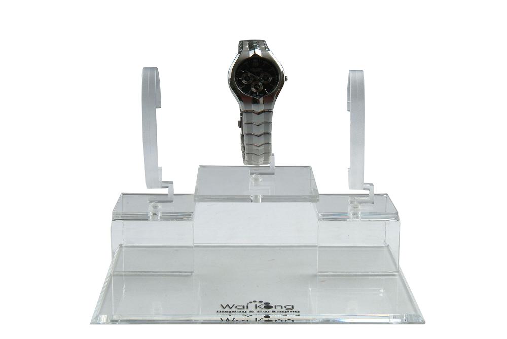 Captivate all the passers-by of your store by displaying your watches with this majestic unit. Built with three raised platforms, each platform has an acrylic bangle stand for showing one watch. Made of flexible material, the stands can hold watches in different sizes stably. This entrancing display unit is also suitable for showing wrist jewelry.