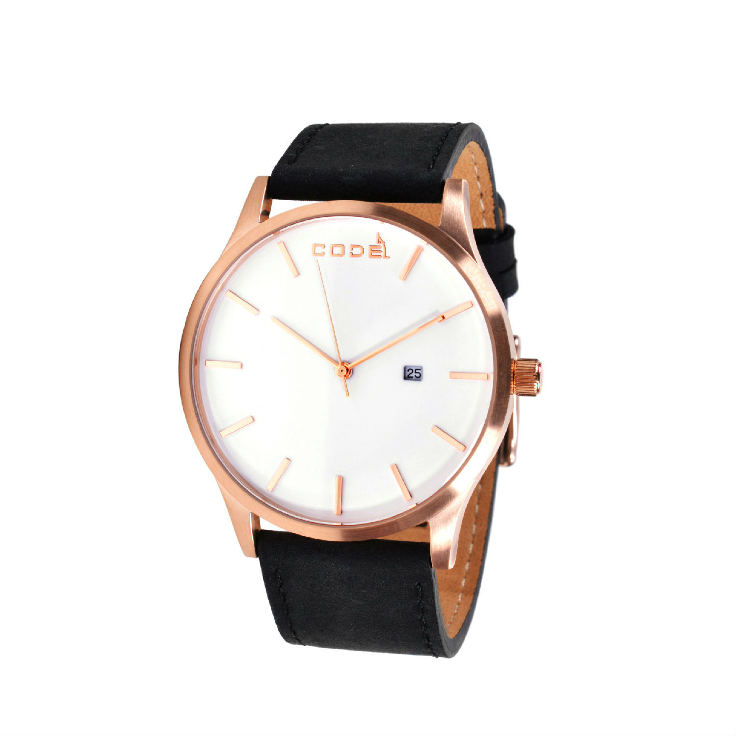 Gleaming hands and dash indices pop against the clean round dial of this wristwatch for modish and effortless time-telling. The rose gold toned bezel and coin-edged crown further balance on a black leather strap to prompt minimalist aesthetics in everyday style.