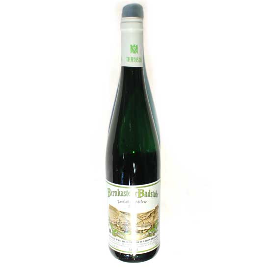 Displayed is a bottle of Wwe Dr. H Thanisch white wine made from fine quality German grapes. The matured fruity taste gives a delicate refreshingness. This white wine is a brilliant idea to match with seafood gourmet.