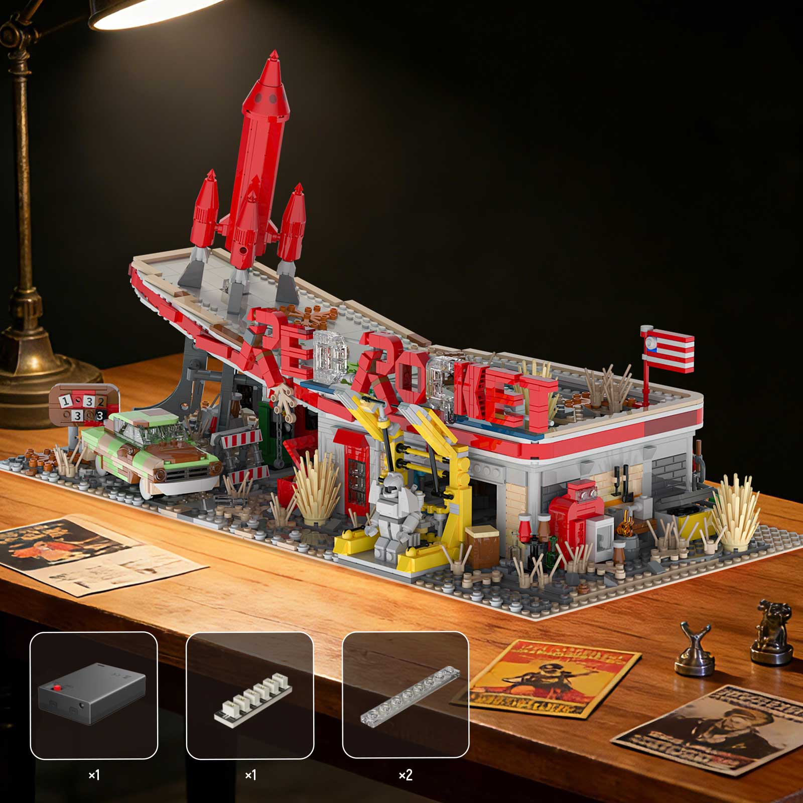 A wasteland-style building block model that brings together rockets, gas stations, weathered vehicles, abandoned robots, and more — creating a scene art that goes beyond architecture. Integrated lighting elevates the display, vividly recreating the post-apocalyptic world. A distinctive desk piece and a prized collectible for wasteland enthusiasts and building block fans.