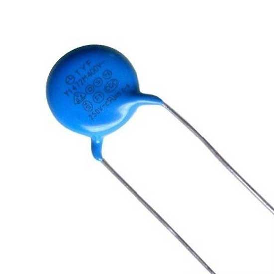 This is a Y safety capacitor made of ceramic (as a medium) and copper or tin-plated lead wires. It is coated with epoxy resin for a long service life. This disc-type safety capacitor is widely used in electronic precision instruments and all sorts of small electronic equipment that can be used for resonance, coupling, filter, rejecting and bypassing.