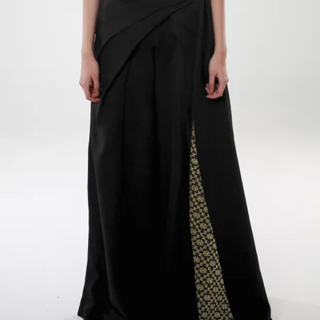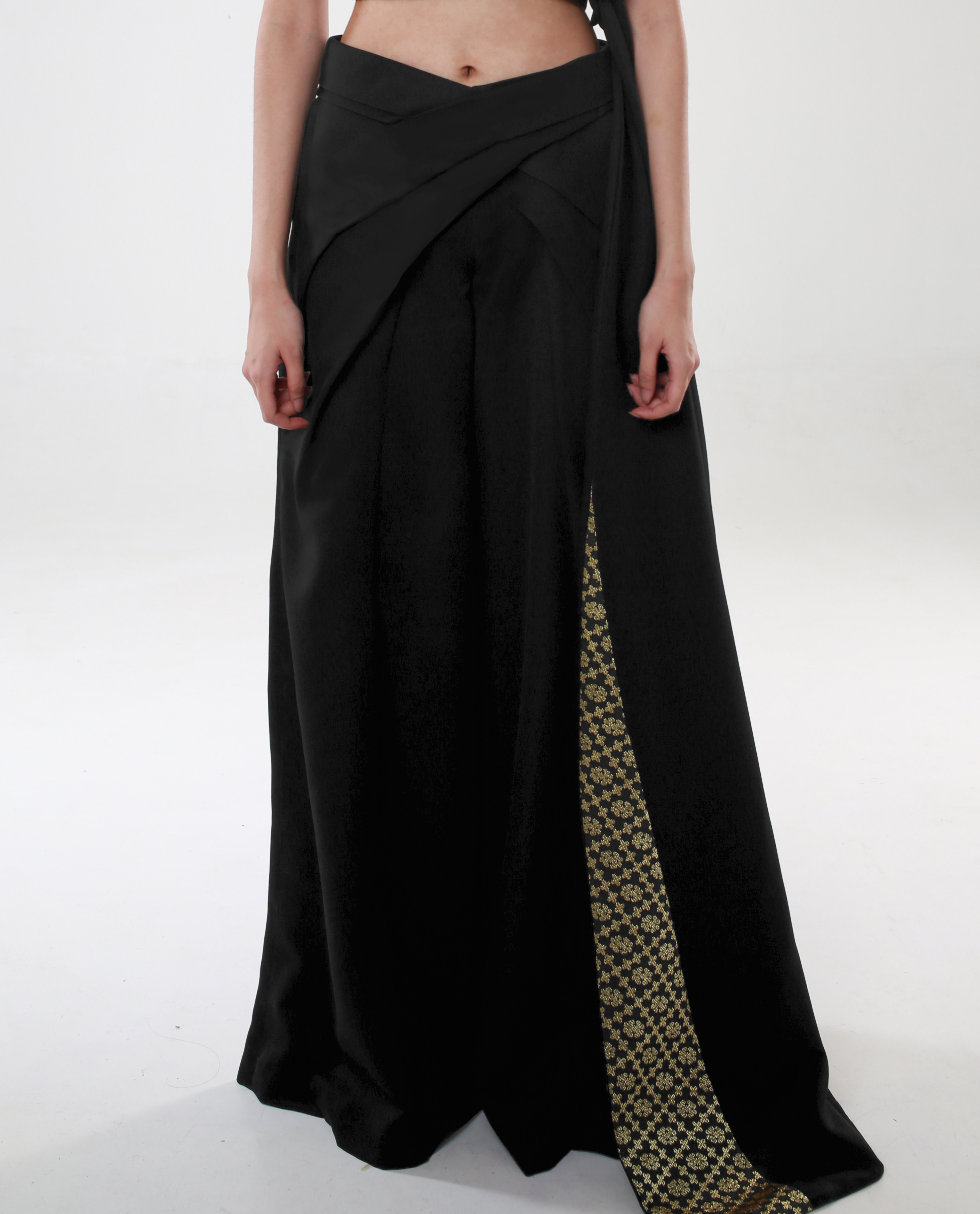 YULIA ORLANDYlow-waisted black draped pants with structured folds a refined yet striking finish