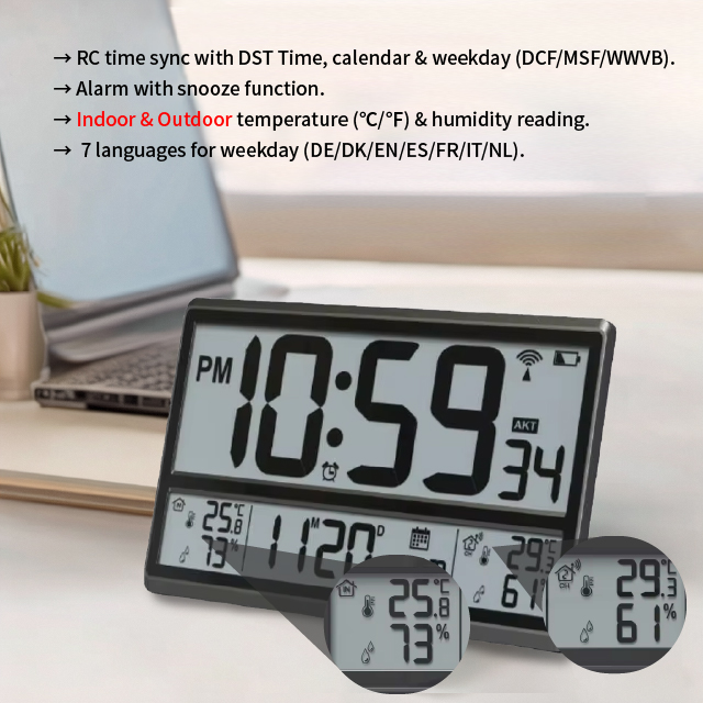 YT60215 Large screen digital clock with indoor and outdoor temperature and humidity display