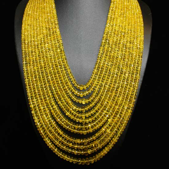 The 26" necklace is strung with well-selected yellow aquamarine beads. These dainty yet precious charms look appealing with their vibrant yellow hue and apparent luster. The necklace is simply excellent for grand moments.