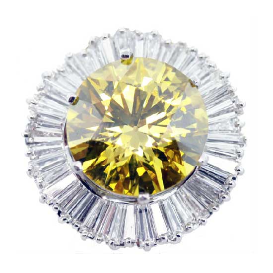 This ballerina ring flaunts a 14.32ct round brilliant vivid fancy yellow diamond set in platinum. It is complemented by approximately 4 carats of white baguette diamonds. This captivating diamond ring is sure to add glamor to your fingers.