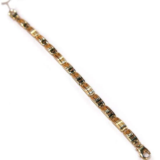 As shown is a yellow gold bracelet. It has light and satin finish. It is a bracelet for men. It is a fashionable accessory which perfectly matches with jeans or T-shirts.