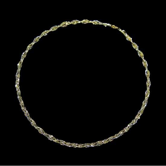 This necklace in yellow gold features a twisted design in 3 tones. The shiny details lure in others’ attention effortless. This succinct yet attractive necklace highlights your looks in an instant.