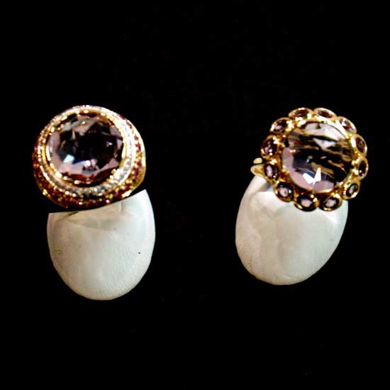 Featured here is an alluring ring that has a unique design. The centerpiece of this nice ring is a large round piece of amethyst set on a gold setting encrusted with pink sapphires. This yellow gold ring is an excellent gift for elegant ladies.