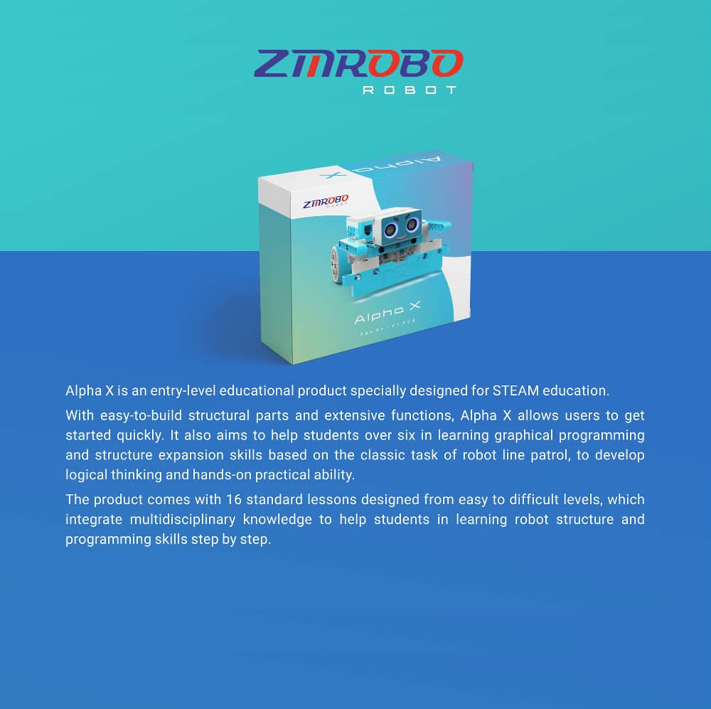 Alpha X is an entry-level educational product specially designed for STEAM education.with easy-to-build structural parts and extensive functions,Alpha x allows users to getstarted quickly. Based on robot line-following tasks, the product is designed to assiststudents over the age of six in learning graphical programming and structure building, aswell as developing a logical mind and hands-on ability.