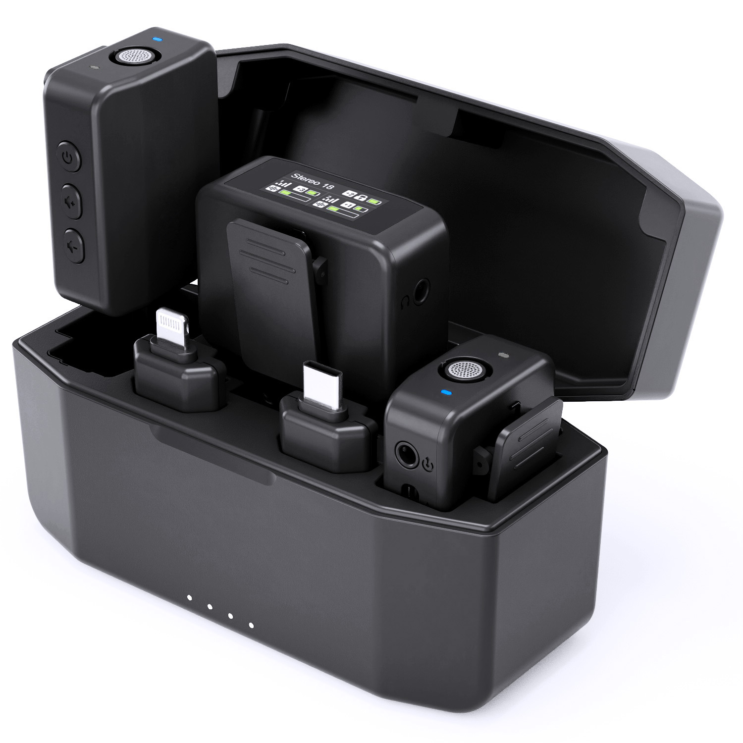 1、Specifications: one for two 2、Wireless frequency range: 2400-2483MHz 3、Audio Frequency Response: 30Hz-20KHz 4、Microphone Type: Condenser 5、Audio delay: <20ms 6、Use distance: 100 meters (open environment) 7、Microphone charging time: <1.5 hours 8、Built-in battery: high-capacity lithium battery 9、Microphone battery life: 6-8 hours 10、Charging time of charging box: 2 hours 11、Charging bin battery life: 2 cycles 12、Signal-to-noise ratio: 56dB 13、Functional use: Outdoor interviews, video shooting, webcasting