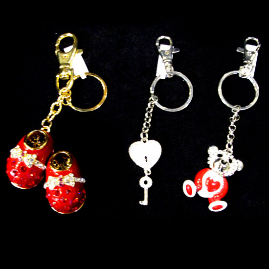 The picture showcases three adorable key chains in a heart, bear or shoes design. Delicately crafted with zinc alloy, the key chains also studded with sparkling crystals for added attractiveness. The key chain comes with a lobster clasp for easy portability.