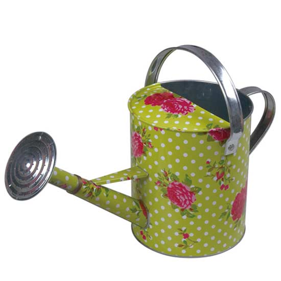 Shown here is a zinc watering pot with a unique and elegant design. The high-quality zinc metal construction of this watering pot is durable for frequent use. This decorative zinc watering pot with polka dot embellishment is a great addition to your garden tools.
