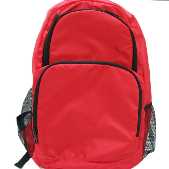 The zipped backpack is made of 230D twilled nylon with a PU backing. It features two zipped front pockets and two side mesh bags. The red color also makes it look young and smart.