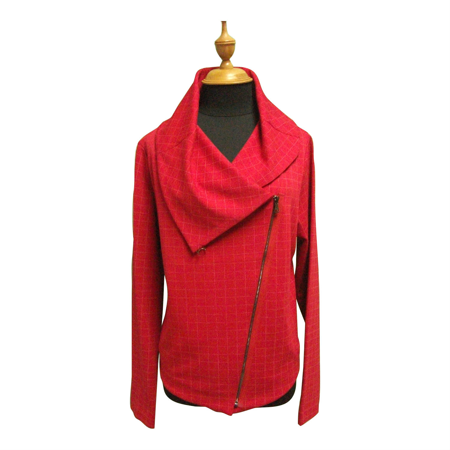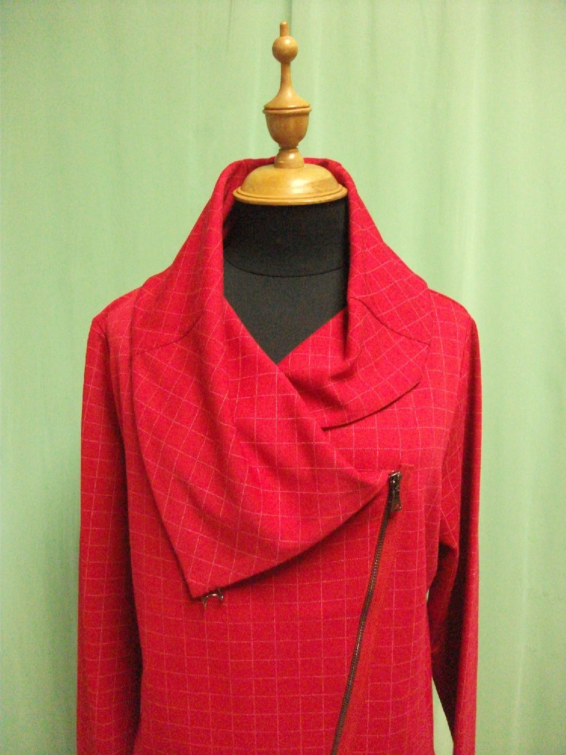 Slant zipper open front jacket, asymmetrical shawl collar, straight welt pocket with zipper closure