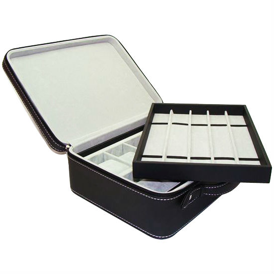 This stylish traveling case is a reliable storage solution for watches and jewelry. The tiered design accommodates products of different varieties. The white stitched detail on the black case is elegant and simplistic.