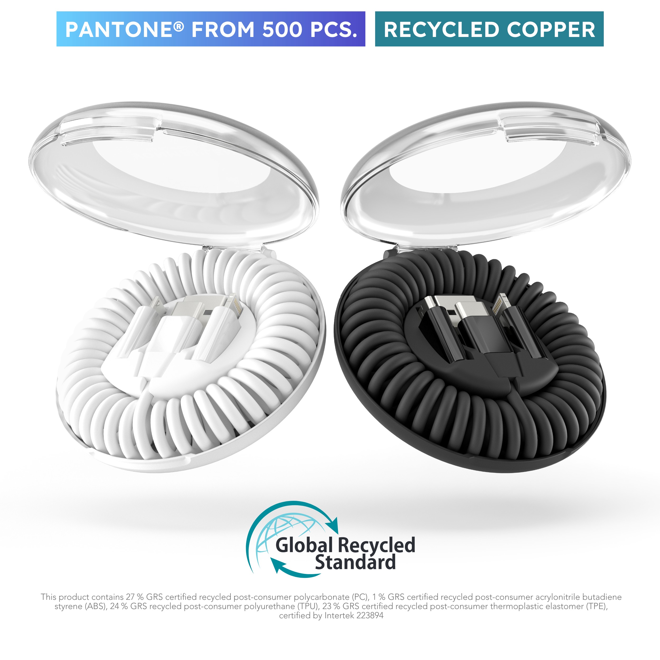 allroundo eco is our sustainable all-in-one charging and data cable (USB-C to USB-C) with fast charging and made for the first time from 75% recycled materials. The meticulously designed spiral cable extends up to 90 cm and provides you even more flexibility and comfort while charging. The minimalistic travel case protects the integrated adapters for USB-A, a Micro-USB and Lightning, making it even more durable. Experience allroundo eco now and enjoy the best and most sustainable all-in-one cable of all times from Vonmaehlen.