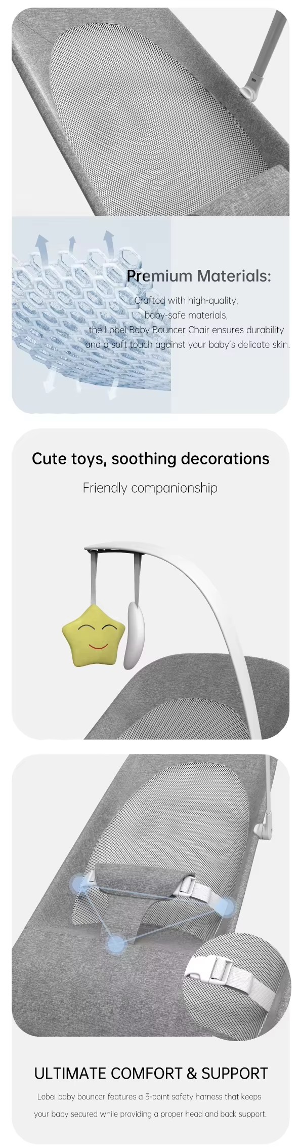 | Our bouncers have an ergonomic design that provides the optimal support for your baby’s back, neck and head. The fitted fabric seat distributes your baby’s weight evenly | |