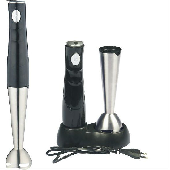 This automatic hand blender set is perfect for dough making, blending, egg beating, pasta making and meat grinding. The slim, long blender features an ergonomic design for easy hand grip. The cordless hand blender comes with a charging base.