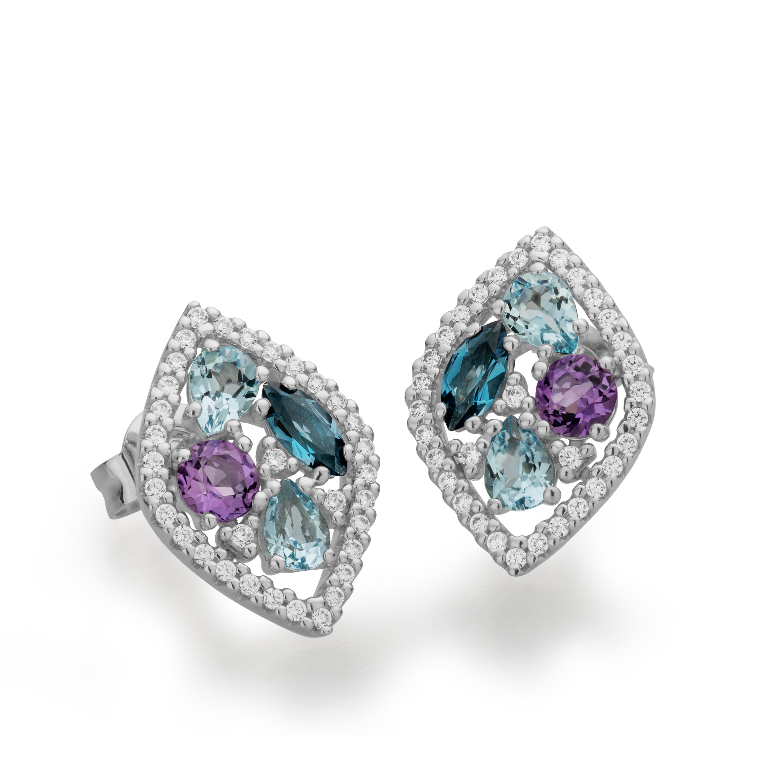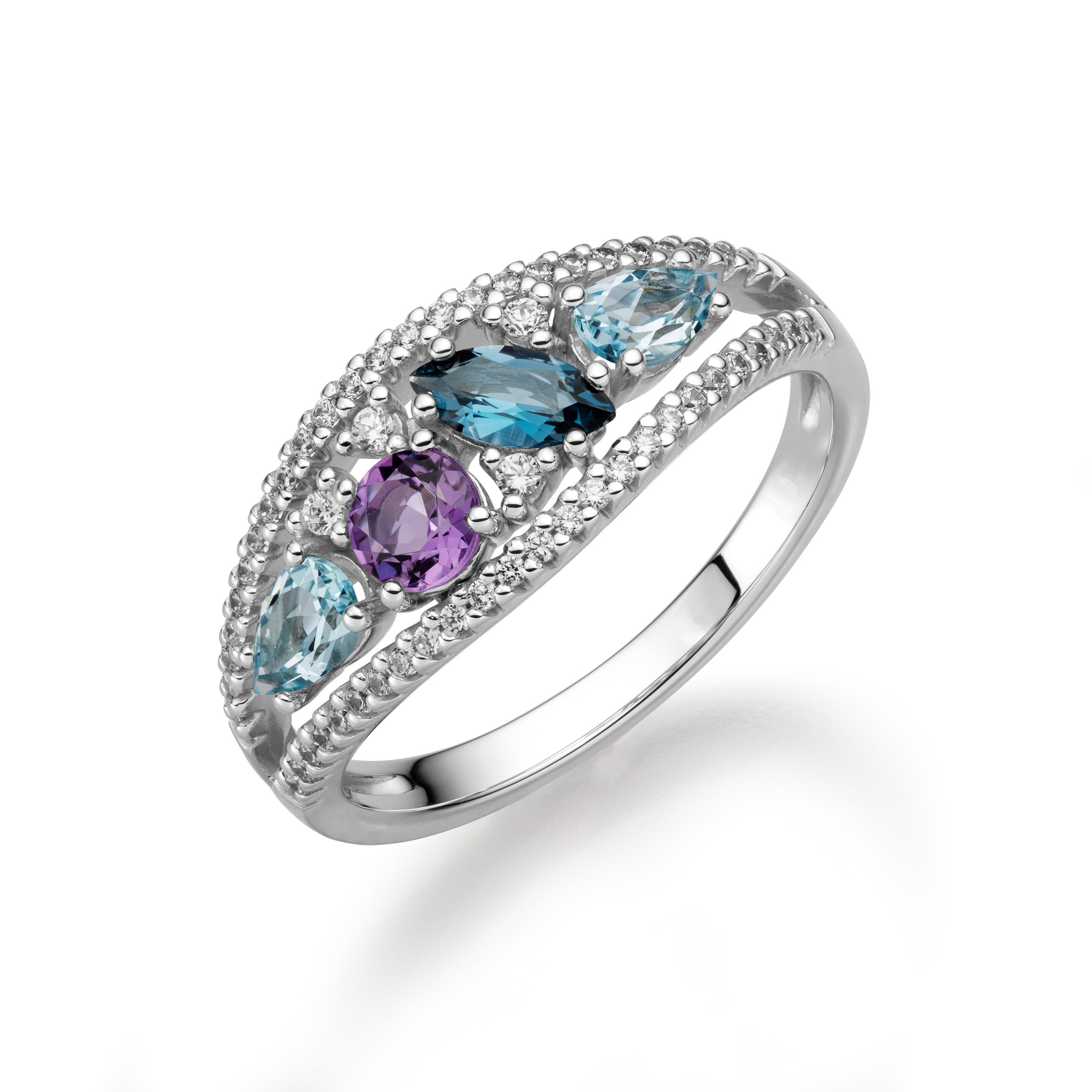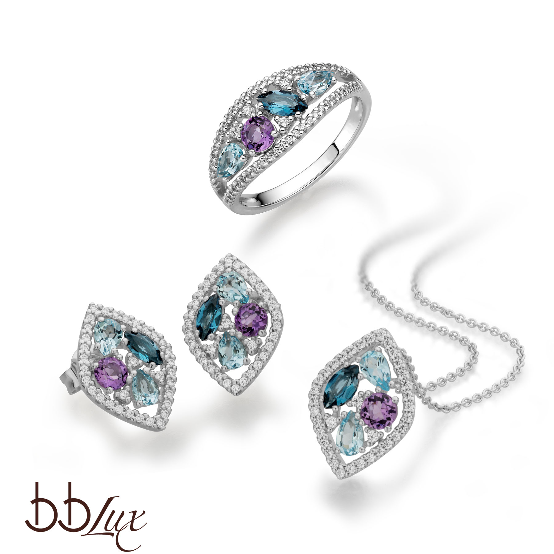 Amethyst, blue topaz in London blue and sky blue, refined with sparkling diamonds, create a radiant composition in this set that is sure to make hearts beat faster. Complemented by its impressive design, this jewelry set exudes an irresistible appeal. A true asset to any jewelry collection.